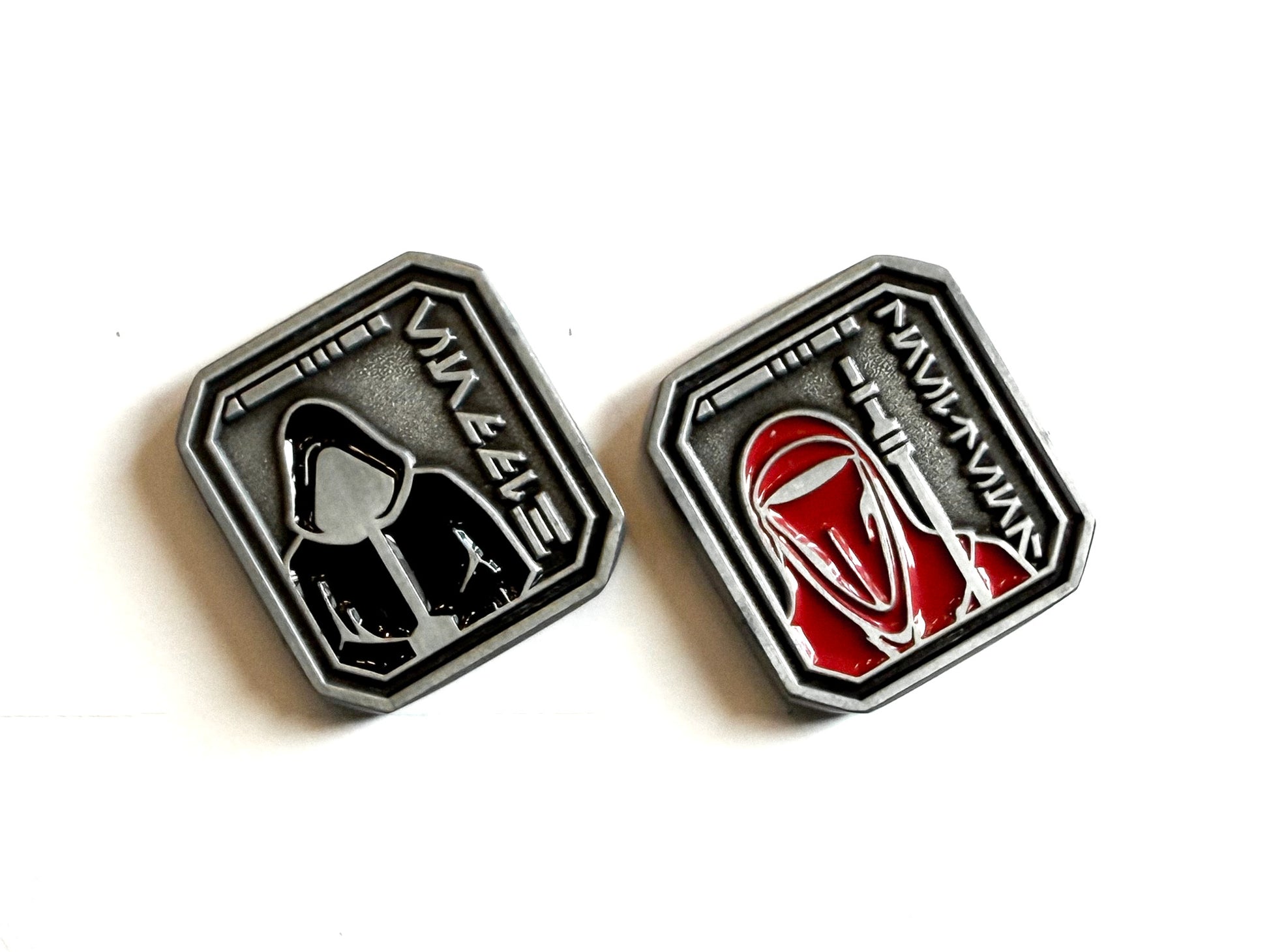 - Bold & Thematic – Cloaked figure / Guard graphics with vivid enamel fill, plus "hidden" and "sentinel" written in Aurebesh for an immersive Star Wars look